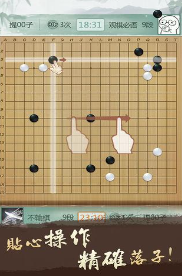 該游戲中,不管你是想人人對戰(zhàn),還是想人機(jī)對戰(zhàn),都可以實(shí)現(xiàn),就看你喜歡怎么玩。游戲棋盤美觀大氣,再配上如山泉水緩緩流淌叮咚作響的美妙配樂,大家的視聽體驗(yàn)絕對不錯。在游戲里下棋,落錯了棋子是可以反悔的,這能讓大家持久立于不敗之地,令大家的信心大漲。游戲操作容易,一只手指頭點(diǎn)擊棋盤交叉處,就能落下一子,誰都可以秒上手。