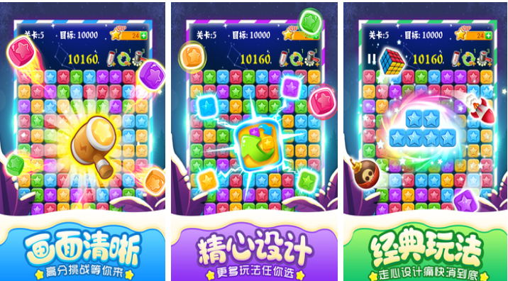 消滅星星愛好者都應(yīng)該玩玩這款新版本的消除闖關(guān)作品,精心設(shè)定的特殊消除關(guān)卡難度都并不高,只要掌握游戲精髓和節(jié)奏就很容易消除得分,畫面塑造干凈清晰也有著簡(jiǎn)單純粹的消除玩法,多元化挑戰(zhàn)任務(wù)也很有趣讓大家消除個(gè)痛快,只要輕點(diǎn)屏幕跟小星星互動(dòng)即可觸發(fā)極為刺激的消除特效了。