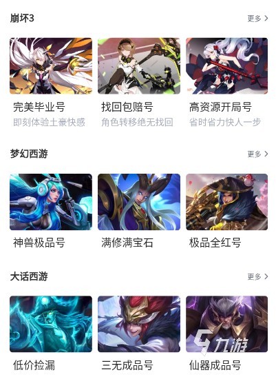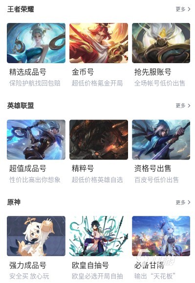 而交易貓中支持的游戲也是非常多的,從熱門的游戲到最近剛剛推出的新游戲都是可以找到大量的玩家進行賬號或者是游戲道具的交易。大家進入主界面之后點擊上方賬號即可進入到交易貓的賬號專場頻道,在這里可以找到一切大家想要交易的游戲。