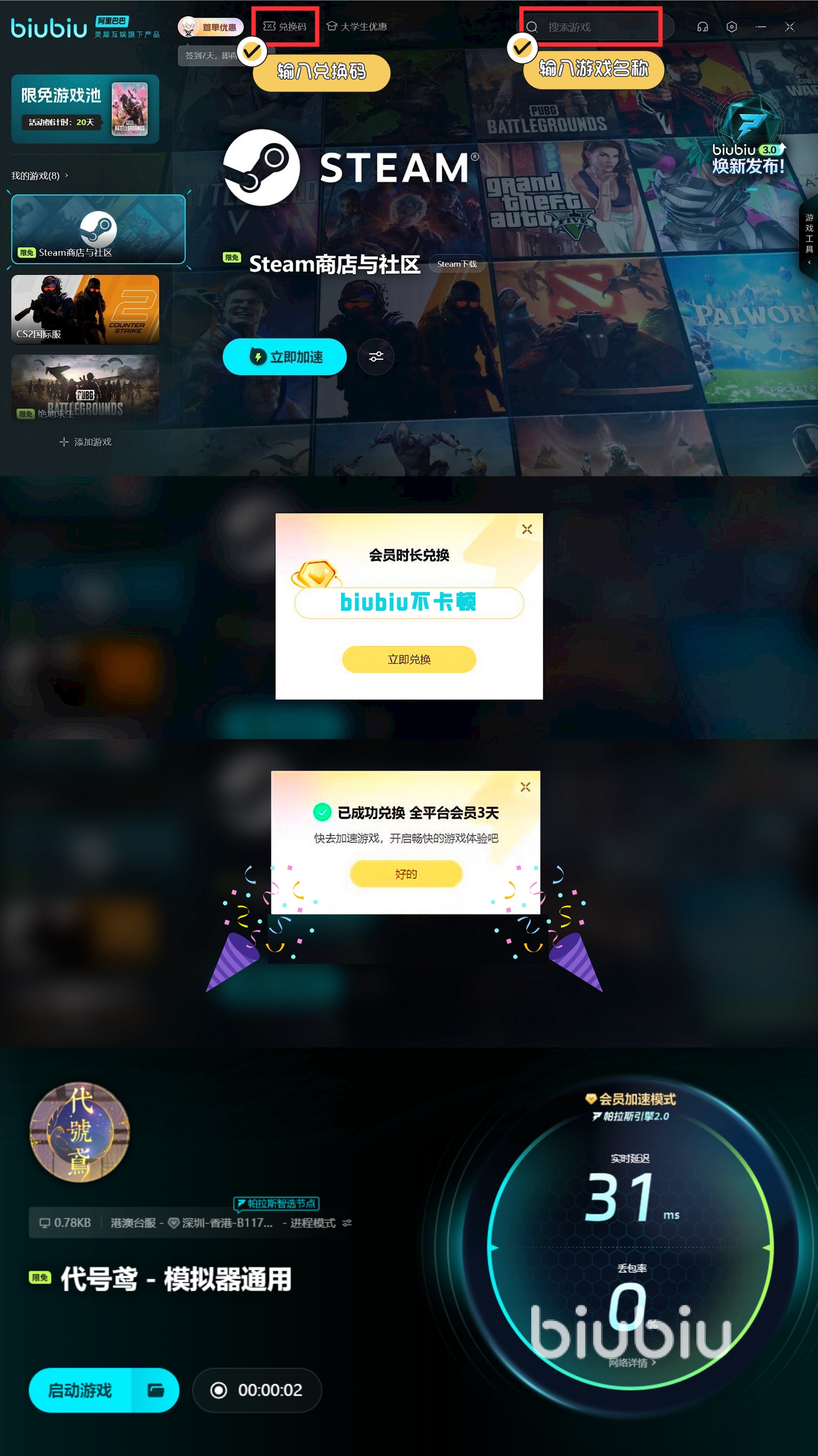 考慮到有些玩家希望到時可解鎖更多福利,其實只需去點擊兌換,然后借助口令【biubiu不卡頓】大家就能順利領取到72h加速時長,這個也是十分不錯的哦。
