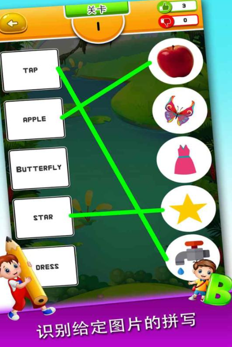 這款游戲致力于提升大家的英語成績設(shè)計。游戲把諸多英文單詞玩出了新花樣,其中有看英語句子回答問題、看圖回答英文單詞等等玩法,這才激活了大家愛玩的天性,讓大家更容易接受英語,不排斥其。游戲為了讓大家不好高騖遠,特別設(shè)定了強制規(guī)則,只要你闖不過當前關(guān)卡,后面的關(guān)卡你就無法解鎖去闖。