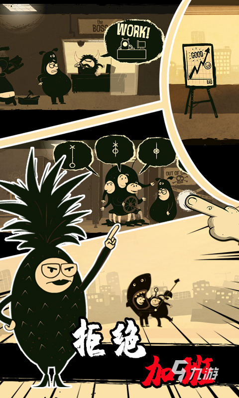 《辦公室冒險》游戲通過獨(dú)具一格的黑黃畫風(fēng)交織設(shè)計(jì),把辦公室的那種沉悶感進(jìn)行了深度的營造,而且又設(shè)計(jì)了樂不可支的翹班題材,其中又將場景進(jìn)行了延伸式的設(shè)計(jì),并且有靈動十足的融入了解謎,冒險的玩法,在每個章節(jié)中游戲都依據(jù)特定的場景,設(shè)計(jì)了翹班任務(wù),在過程中,你需要窮思極想去避開老板的視線,逃出辦公室。
