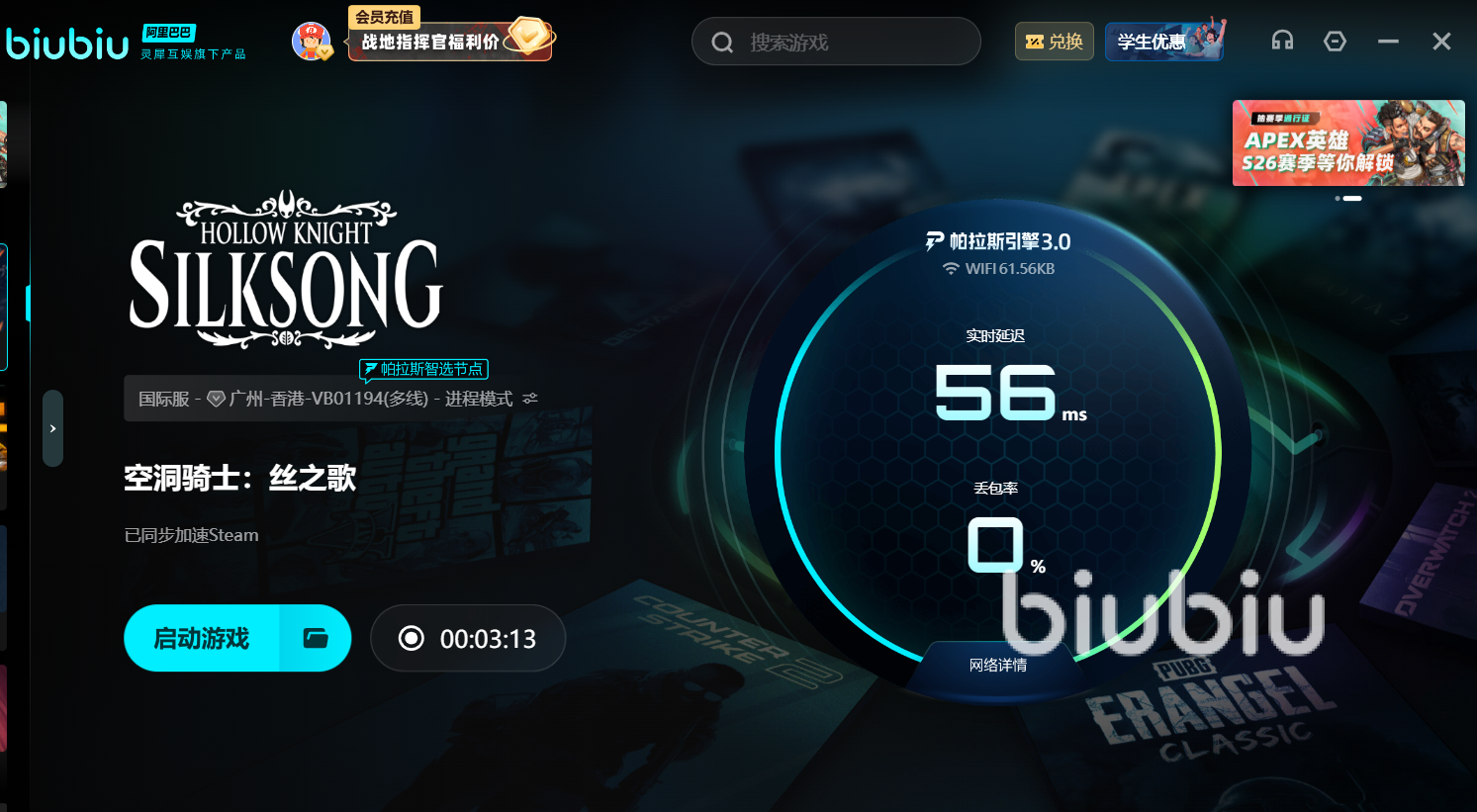 此刻選擇biubiu更能坐享豐厚加速禮遇,新手注冊(cè)立獲24小時(shí)無延遲時(shí)長,此外輸入【biubiu不掉線】便可延長72小時(shí)高速加持,綜合所得總暢玩時(shí)長高達(dá)96小時(shí),足夠應(yīng)對(duì)空洞騎士絲之歌游戲的整個(gè)下載過程。
