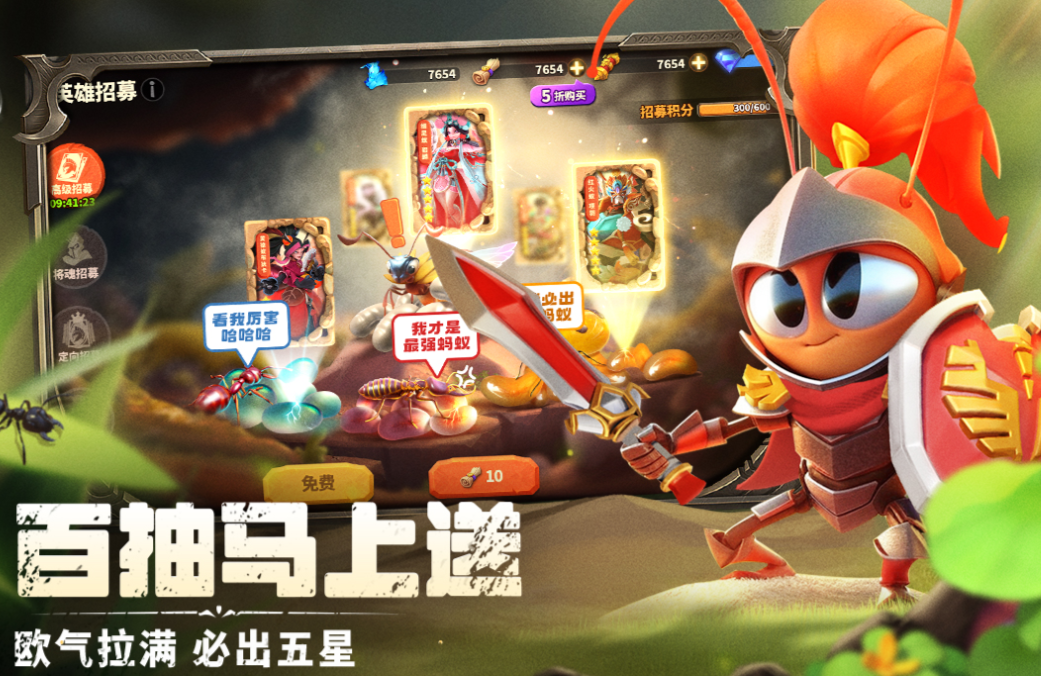 蟻?zhàn)遽绕鹗强畛尸F(xiàn)出寫實(shí)3D畫面的螞蟻主題策略游戲,獨(dú)創(chuàng)的進(jìn)化機(jī)制會讓大家了解螞蟻王國的等級關(guān)系,蟻后、工蟻等特殊的兵種都可以進(jìn)行進(jìn)化升級,抽卡解鎖各種螞蟻皮膚的基礎(chǔ)系統(tǒng)可玩性更高,全3D的螞蟻世界觀塑造的熠熠生輝,加入了放置卡牌排兵布陣的系統(tǒng)玩起來策略性十足,各種小螞蟻相關(guān)的知識你也可輕松掌握。
