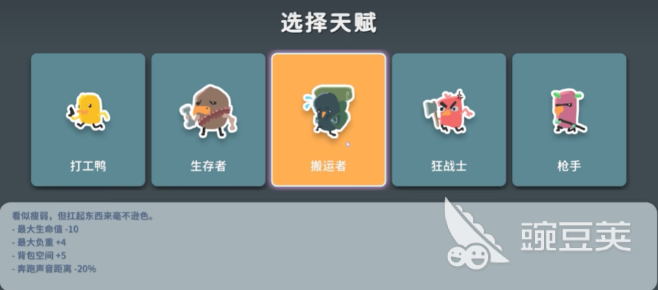 搬運(yùn)者:雖體格偏弱,但負(fù)重能力強(qiáng),最大生命值減少15%,背包容量增加5格,最大負(fù)重提升10單位,缺點(diǎn)是奔跑時(shí)發(fā)出的聲音傳播距離減少20%。