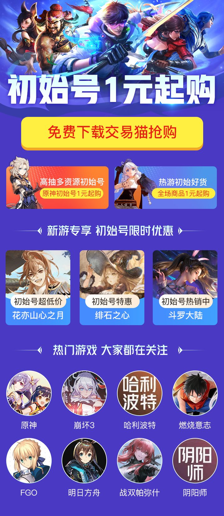 想要買號,玩家首先就要考慮安全性,其次就是價格問題,最好是物美價廉那種,這里小編著重推薦大家選擇交易貓,交易貓是一個非常值得大家信賴的平臺,不但擁有最全的游戲資源,還有超多福利活動,像什么成品號、初始號、自抽號等等,在這里都能以最低的價格買到,甚至有時候,平臺做活動,玩家還能一元秒殺超值產(chǎn)品。