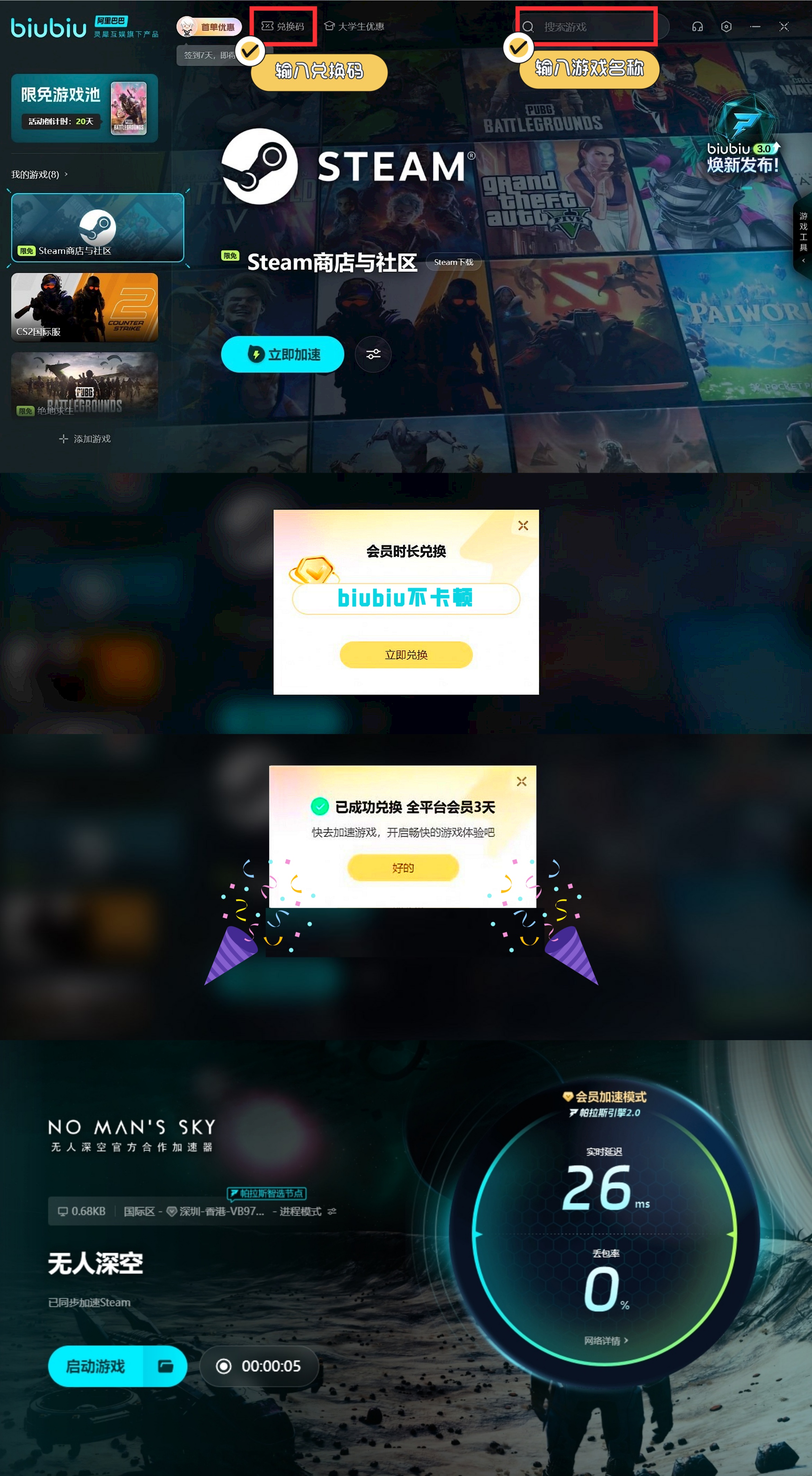 若是各位到時(shí)希望能解鎖更多加速時(shí)長(zhǎng),那么還可考慮去點(diǎn)擊界面中的兌換按鈕,然后再去利用【biubiu不卡頓】,如此一來(lái)所有平臺(tái)用戶(hù)都能順利領(lǐng)取到72h的加速時(shí)長(zhǎng),這個(gè)也是很給力的哦。
