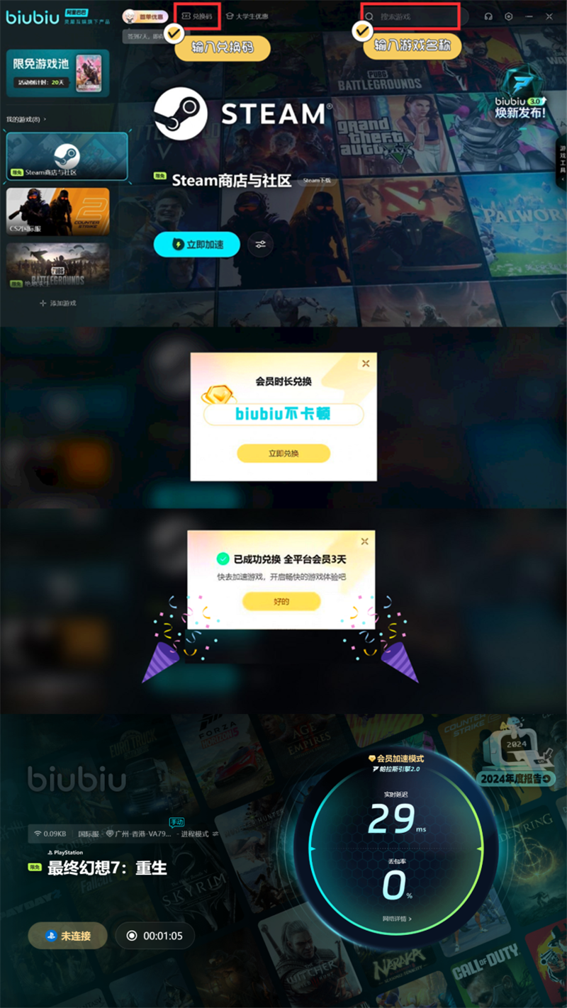 無論大家選擇購買哪一版本,游戲本體都是最重要的內(nèi)容,為了能夠讓游戲更為流暢的運(yùn)行,小編推薦使用biubiu加速器去打開游戲客戶端。無論是在ps還是pc端,都能有優(yōu)質(zhì)的加速效果?,F(xiàn)在注冊(cè)一個(gè)新的biubiu賬號(hào),立即就能領(lǐng)取三小時(shí)會(huì)員時(shí)間,先來感受一下真實(shí)的優(yōu)化狀態(tài)。另外還有一項(xiàng)是每個(gè)號(hào)都能領(lǐng)取一次的兌換碼福利,只需要將【biubiu不卡頓】填寫進(jìn)去就能夠兌換三天會(huì)員時(shí)間,超多的福利千萬不要錯(cuò)過。在游戲中可以欣賞到非常精良的畫面制作和精彩的劇情以及戰(zhàn)斗場(chǎng)景,絕對(duì)是一款不可錯(cuò)過的大作。