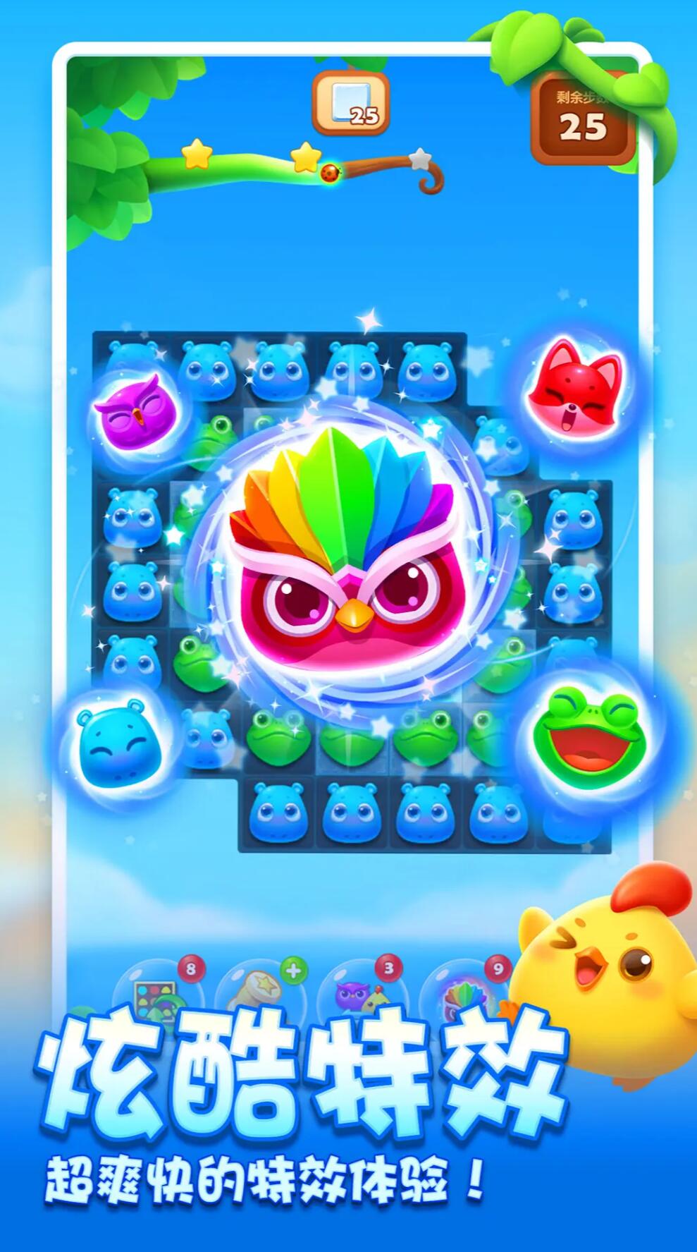 簡單來說就是三消,通過交換色塊觸發(fā)消除,四連生成直線特效,五連變活力鳥。讓你一次清除一大片!基礎(chǔ)關(guān)卡8×8規(guī)格方便入門,后期的元素庫包含7種基礎(chǔ)色塊與5類特效模塊可以說上限也很高,連鎖反應(yīng)最多支持15次連續(xù)觸發(fā),爽點(diǎn)直接拉滿,上億玩家的休閑之選,小編也非常推薦!