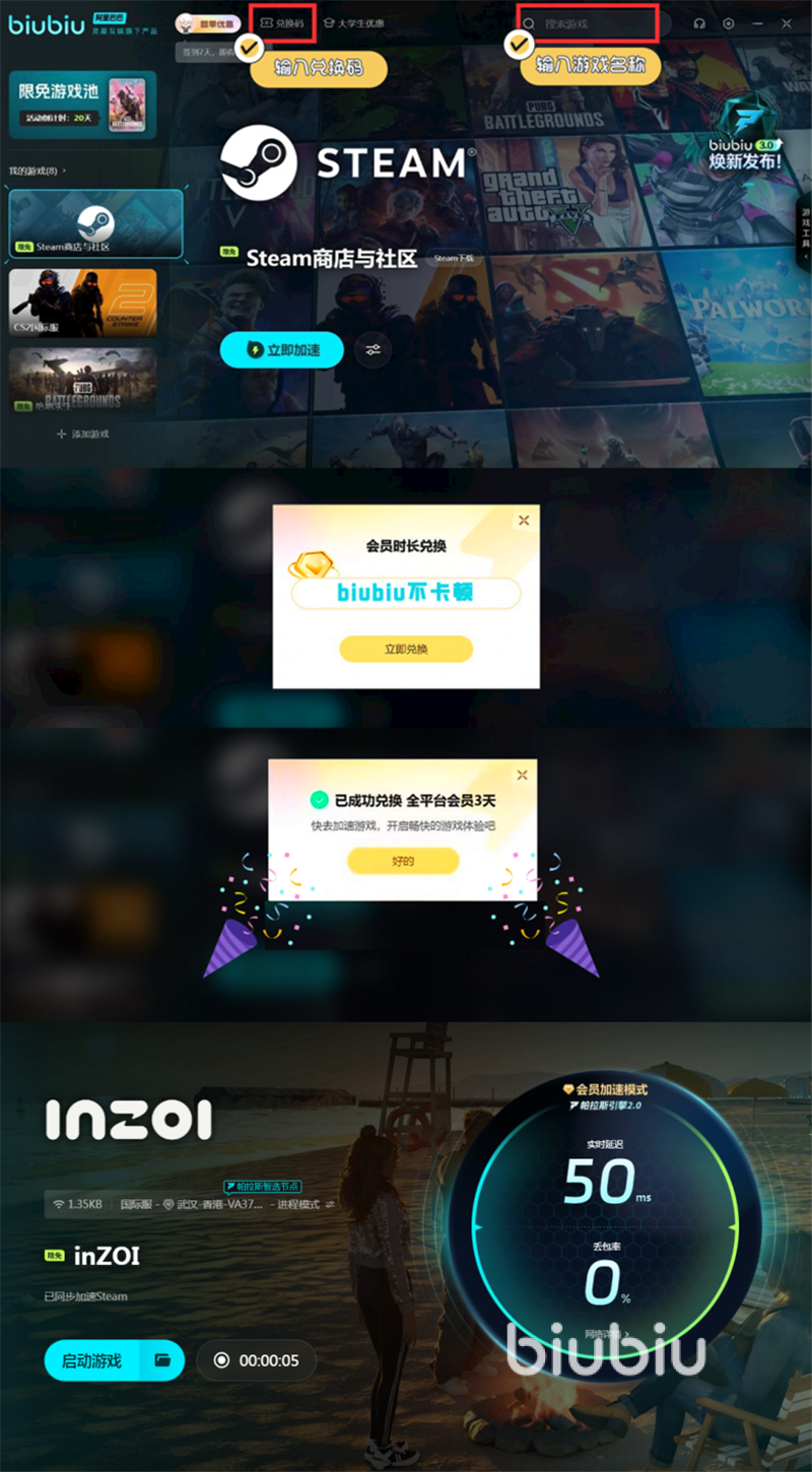 因為游戲高畫質(zhì)以及擁有大量的數(shù)據(jù)需要處理,所以運行過程為了更加順暢些,biubiu當(dāng)然是不可缺少的工具,biubiu操作簡單便捷,現(xiàn)在更是推出了免費試用活動。例如每個號都能使用一次兌換碼【biubiu不卡頓】去兌換一次三天會員時間的福利。如果是剛剛注冊的新號,還能額外領(lǐng)三小時會員。玩家還可以利用游戲內(nèi)置的服飾裁剪功能,對于具體服裝再進行一下修飾,例如在袖子、下擺或領(lǐng)子處,進行自己感興趣的裁剪設(shè)計。還有多種預(yù)設(shè)服裝可以選擇,如果感覺其他玩家分享的服裝預(yù)設(shè)比較符合自己的審美,也能直接復(fù)制過來。
