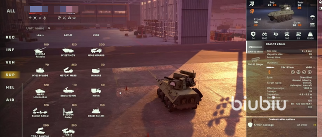 支援欄包括重型防空系統(tǒng)、自行火炮、自行火箭炮、排擊炮車、運(yùn)輸車、遠(yuǎn)程火力、伴隨防空車等等,主要負(fù)責(zé)攔截固定翼飛機(jī)和給戰(zhàn)場提供遠(yuǎn)程火力,一般都跟著步兵和裝甲單位防空,運(yùn)輸補(bǔ)給和兵源。