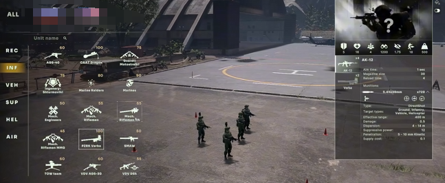偵察欄有步兵班、狙擊手、無人機(jī)、偵察車、直升機(jī)、輕型裝甲、坦克,在游戲中的偵查視野和隱蔽性比普通單位高,主要用來開拓視野以及滲透。