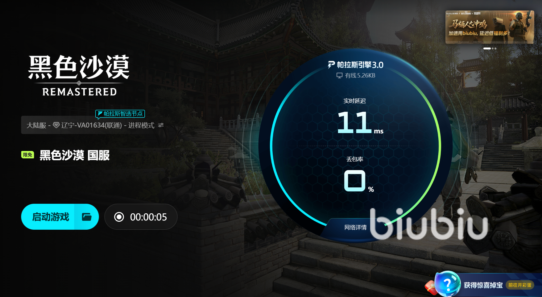 黑色沙漠是一款以沉浸感著稱(chēng)的游戲,它的魅力不在勝負(fù),而在于你活在這個(gè)世界中。解決黑屏不是為了提升幀數(shù),而是為了確保你可以真正進(jìn)入這個(gè)世界、存在于這個(gè)世界。當(dāng)連接穩(wěn)定,你的角色才能真正睜開(kāi)眼睛,你的旅程才開(kāi)始變得真實(shí)。使用biubiu加速器,就是為了讓你和這片大陸重新建立聯(lián)系,打開(kāi)命運(yùn)的大門(mén),而不是永遠(yuǎn)盯著一塊黑屏發(fā)呆。