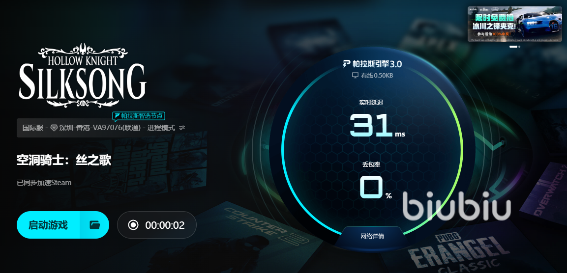 以上就是小編整理的空洞騎士絲之歌黑屏閃退卡頓延遲丟包怎么辦所有內(nèi)容,其實行業(yè)中早有研究指出,游戲中所遇到的大部分問題,有超過70%問題和網(wǎng)路相關,所以通過使用biubiu加速器解決了網(wǎng)絡不穩(wěn)定問題后,也就能讓大家在玩游戲時,避免大部分問題。