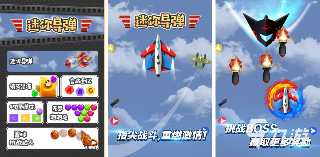 《迷你導(dǎo)彈》這款游戲中你主要可以挑戰(zhàn)以下導(dǎo)彈發(fā)射 的玩法,這種玩法很像以前的飛機(jī)大戰(zhàn),還有其他的小游戲入口,比如消滅果凍是消除的玩法,還有合成到Z是合成的玩法,各類小游戲大家隨意進(jìn)入。