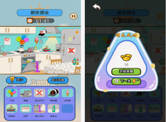 游戲可讓玩家,進入充滿著卡通又能量的背景世界當(dāng)中,想要完成任務(wù)的話,必須要在豐富的場景,甚至是細節(jié)當(dāng)中在規(guī)定時間內(nèi),找到所具備的不同物品,更能在答題的時候,得到相應(yīng)的獎勵。相對于在兩張看上去一樣的圖片當(dāng)中找不同的,這款是可進入不同的場景當(dāng)中,找出不符合場景的物品,還支持提示這樣的功能。