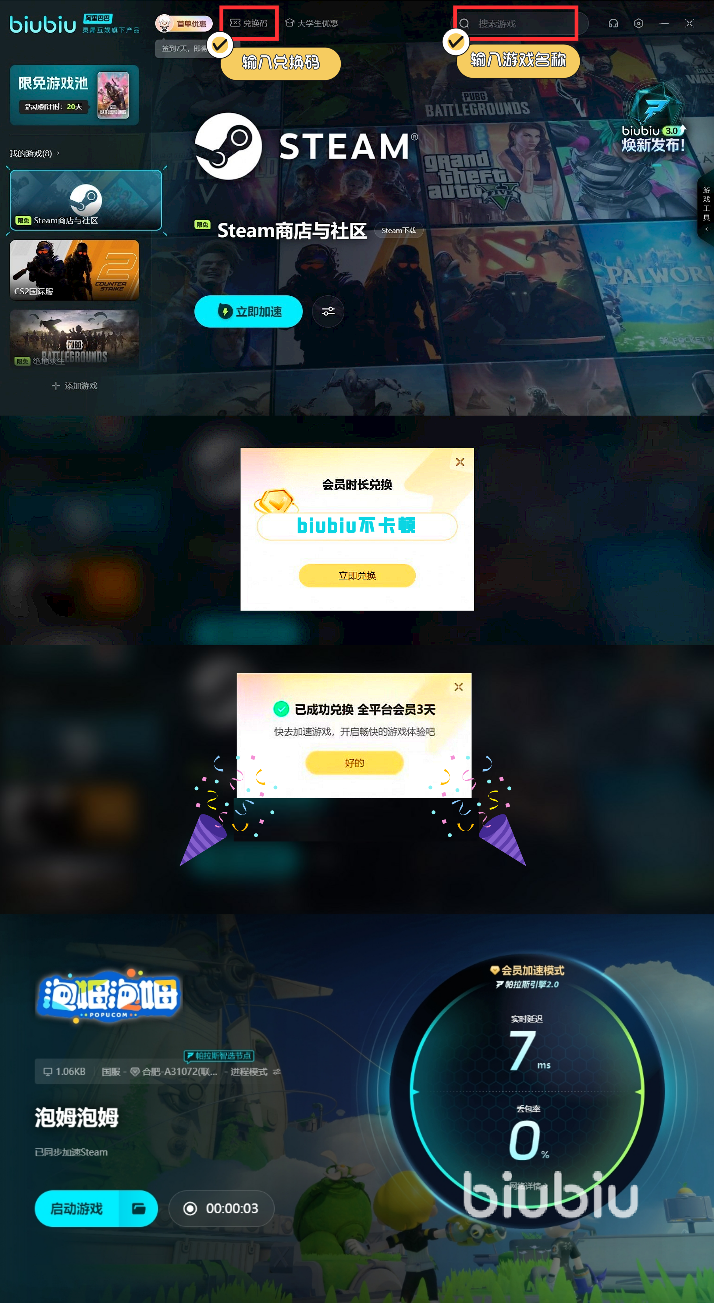 對于一些希望能解鎖更多加速福利的朋友而言,其實(shí)還可主動(dòng)來點(diǎn)擊兌換,然后借助其口令【biubiu不卡頓】,這樣一來所有平臺(tái)用戶均可順利領(lǐng)取到72小時(shí)加速,助力自己去獲得不錯(cuò)的體驗(yàn)。