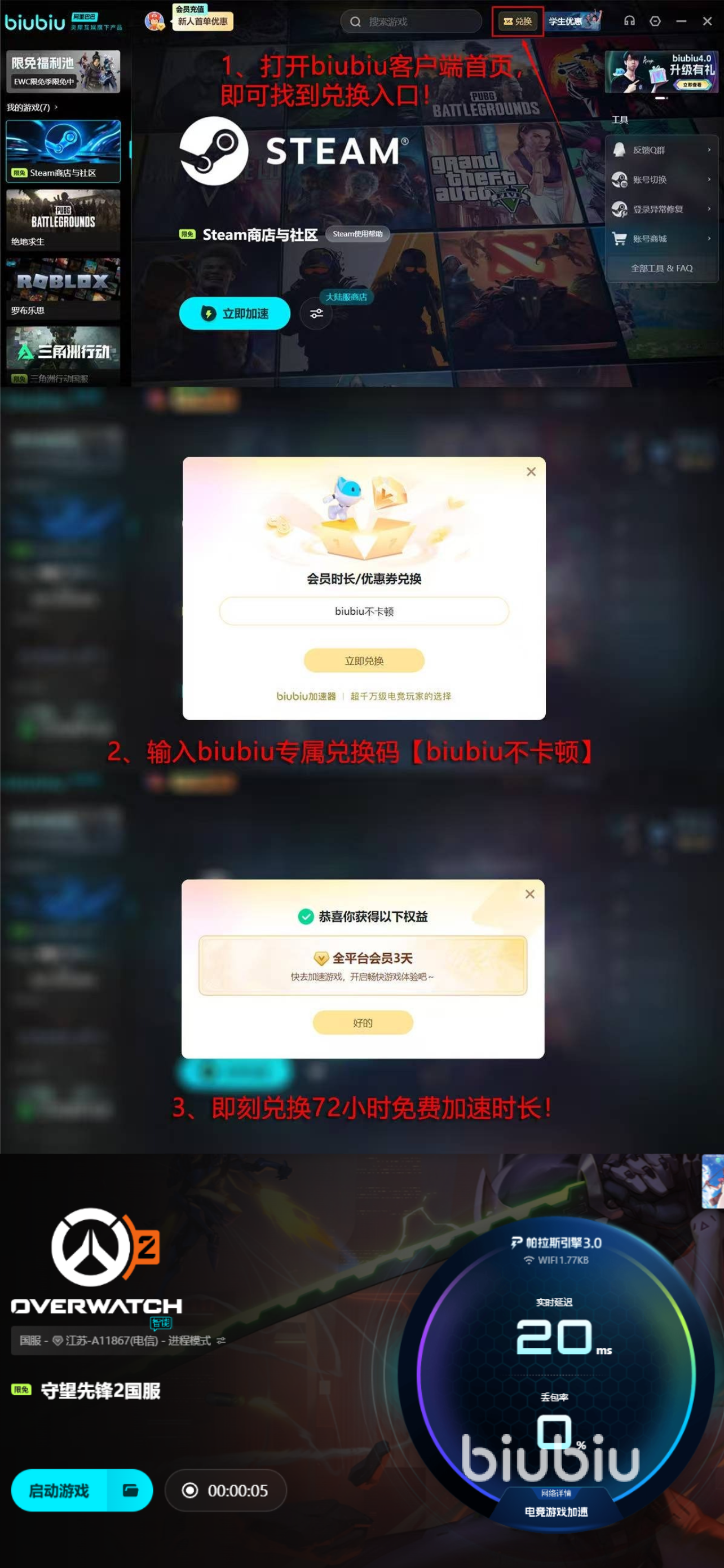 新人登錄注冊立刻就有24小時免費提速服務(wù),而且現(xiàn)在,大家還可以通過【biubiu不卡頓】這個兌換碼,來獲得三天,也讓就是72小時加速體驗時間,也是不需要花錢的。而且當(dāng)下正值暑期福利活動,小伙伴們還可以參與平臺的抽獎活動,運氣好的話還有可能抽到終身加速卡,和人氣冠軍選手Aixleft一起體驗這個經(jīng)過了重磅升級,而帶來的帕拉斯引擎3.0版本加速應(yīng)用。