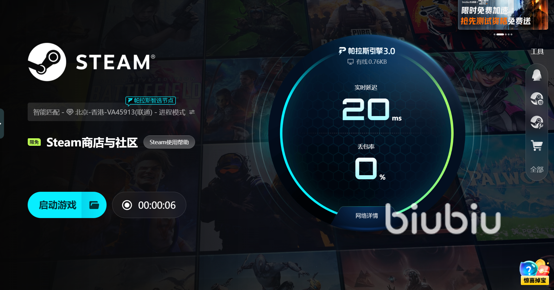要想徹底擺脫掉幀困擾,首先得讓網(wǎng)絡(luò)穩(wěn)定下來(lái)。biubiu加速器能從底層優(yōu)化傳輸通道,確保連接順暢。借助Steam加速功能,biubiu會(huì)重新規(guī)劃數(shù)據(jù)傳輸路線,避開高延遲節(jié)點(diǎn),讓信號(hào)更順暢直達(dá)。延遲、丟包與抖動(dòng)明顯降低,游戲加載與運(yùn)行都更加平穩(wěn)流暢。新用戶注冊(cè)即可獲得24小時(shí)加速體驗(yàn),輸入【biubiu不卡頓】還可額外解鎖72小時(shí)。連續(xù)幾天的實(shí)測(cè)足以涵蓋登錄、更新、匹配到實(shí)戰(zhàn),讓掉幀徹底成為歷史。