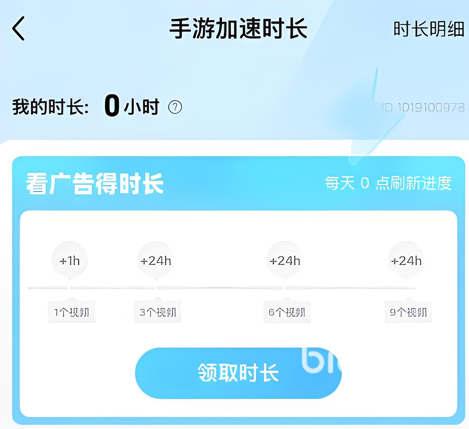 選擇biubiu加速器手游端的話,只要觀看視頻就能獲得相應(yīng)的免費加速時間,最多可以獲得24h的免費加速,不過獲得的加速時間過了24點會清零,這樣的方式能讓玩家根據(jù)自己的游戲市場需求來領(lǐng)取相應(yīng)的加速時間。