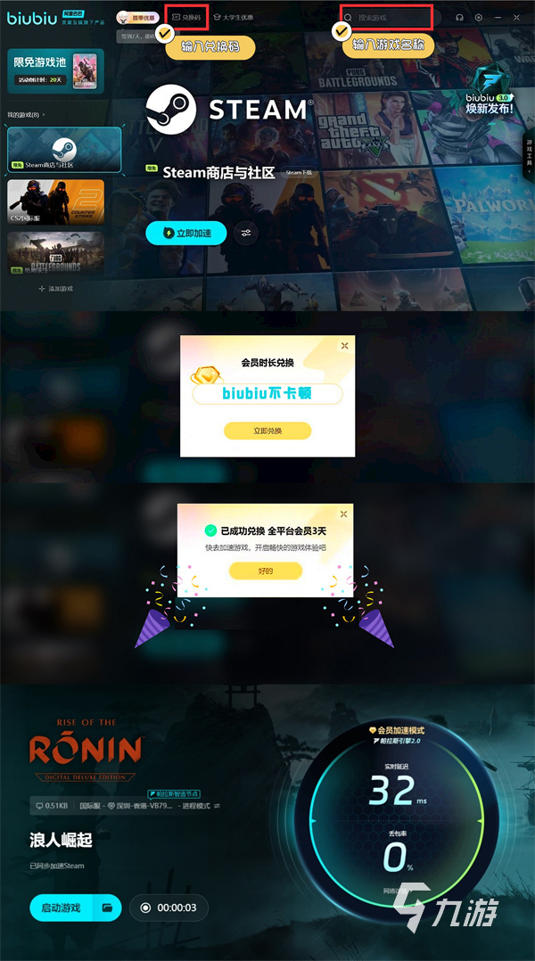 同時各位想要去解鎖更多福利的朋友,到時還可在兌換界面輸入“biubiu不卡頓”,這樣就能領(lǐng)取72小時加速機會,讓各位無需去充值,就能長時間體驗其出色的加速性能。