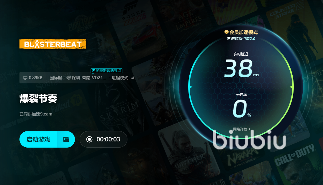 此外,由于《爆裂節(jié)奏》對反應速度要求極高,任何的卡頓或延遲都會影響玩家的操作和游戲進度,進而影響到游戲的娛樂性和競爭性。此時,優(yōu)化網(wǎng)絡環(huán)境,減少延遲和丟包率,成為解決卡頓問題的關鍵。針對《爆裂節(jié)奏》中的卡頓問題,biubiu加速器為玩家提供了高效的解決方案。biubiu加速器通過專線連接技術、智能節(jié)點切換技術和多路發(fā)包技術,確保玩家在游戲過程中能夠擁有更穩(wěn)定的網(wǎng)絡環(huán)境。通過這些技術的結合,biubiu能有效優(yōu)化玩家與服務器之間的數(shù)據(jù)傳輸,減少因網(wǎng)絡波動、丟包等引起的卡頓和延遲。