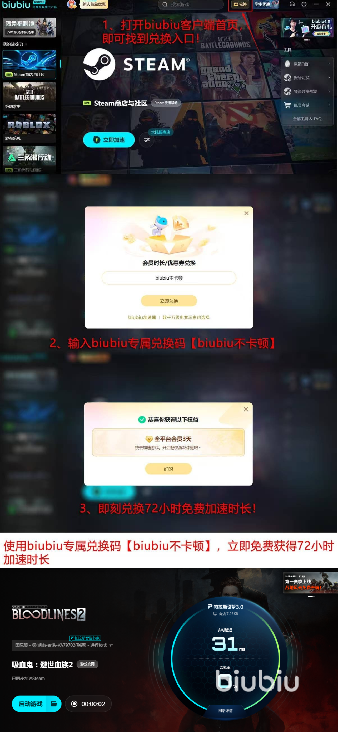 值得夸贊的是這個應用為新用戶考慮到的地方非常多,比如有些玩家擔心會亂花錢,畢竟有些應用是需要付費才可以使用提速服務的,大家擔心花了錢之后,但是效果達不到自己的預期,而biubiu就可以很好的處理這一方面,給新用戶提供24小時免費提速服務,新人在注冊成功時就可以收到,平臺自動打到大家的賬戶之中。同時平臺還給所有人提供三天體時長,這是針對小伙伴們個人的休息時間而定的,需要大家在指定區(qū)域通過【biubiu不卡頓】領取兌換。