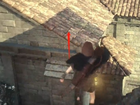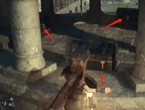 大家到了屋頂之后,一定要把鏡頭調(diào)轉(zhuǎn)過(guò)去。這樣就可以跳到下面的這個(gè)位置了,也就是說(shuō)去比較高的那個(gè)圓臺(tái)上。只要是爬到這個(gè)地方就能夠看到有三個(gè)寶箱,大家把這三個(gè)寶箱撿起來(lái)就好了。接下來(lái)就可以去右側(cè)的屋頂上,緊接著將我們的視線對(duì)著這個(gè)標(biāo)注的位置繼續(xù)走。只要是大家順著這個(gè)路線走過(guò)來(lái)之后,就會(huì)發(fā)現(xiàn)這個(gè)地方還有一個(gè)寶箱,把這4個(gè)寶箱全部撿起來(lái)就好了。