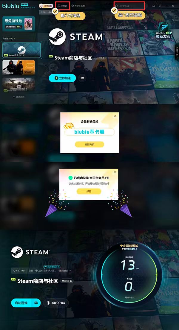 在等待期間,大家還可以用這個(gè)平臺(tái)給其他游戲加速,可以服務(wù)的對(duì)象還是很多的,而且還給新人提供了超多福利,比如24小時(shí)免費(fèi)提速時(shí)間,注冊(cè)即可自動(dòng)獲取,稍后還可以使用【biubiu不卡頓】在兌換碼區(qū)域換三天的體驗(yàn)時(shí)間,每個(gè)用戶(hù)僅可換一次。