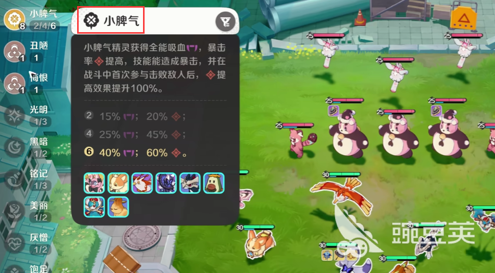 六層的暴擊率效果為60%,同時(shí)附帶有40%的全能吸血,當(dāng)然,每一個(gè)小精靈都會(huì)附帶有,兩種不同類型的屬性值,飽足屬性搭配小脾氣屬性的疊加,能夠提升己方單位的攻防能力。