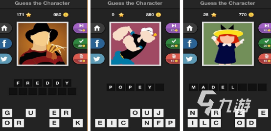 超多好萊塢明星以及可愛的卡通角色都會在這里呈現(xiàn),比如迪士尼中的米老鼠,又或者是羅賓漢,令人上癮的猜字謎手游。每個人物以卡通形象呈現(xiàn),只要詳細(xì)觀看具有特色的精髓,就能夠快速猜測,而下方推送出一系列字母,點擊字母組合,成為正確的名稱。努力猜測出相應(yīng)的角色,展現(xiàn)出你的智慧頭腦及靈活的反應(yīng)。