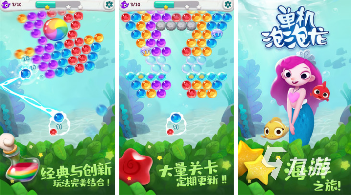 單機泡泡龍亦是一款美人魚題材的消除闖關(guān)游戲,經(jīng)典的泡泡龍玩法加上全面升級的畫質(zhì)讓人難以忘懷,美妙的海底美景和可愛的魚類相得益彰,你將與美人魚一起在海底世界拯救魚寶寶,利用發(fā)射泡泡的方式進行一系列的消除任務(wù),大量的關(guān)卡以及多元化的輔助道具讓玩家越玩越上癮,炫麗的爆炸特效和不錯的物理碰撞效果也是游戲的魅力所在。