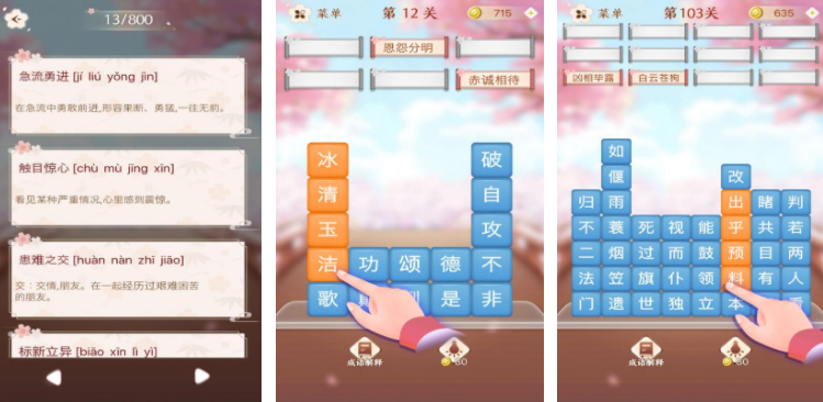 如果想要快速記憶大量的成語,最推薦的就是成語消消闖關(guān),里面會有比較創(chuàng)新的一種玩法,讓玩家快速記憶大量的成語,很多成語都會有相同的漢字,游戲里會把這些成語互相交錯,玩家需要在空位上填寫這些漢字,這樣就能同時補全兩個成語,關(guān)于成語的意思也會在補全之后出現(xiàn),想要學(xué)習(xí)成語的玩家不要錯過游戲。