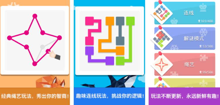 腦力達人是一個能放松的游戲,里面會設(shè)定很多趣味的玩法,玩家可以在益智挑戰(zhàn)中,不斷證明自身的能力,可以選擇比較簡單的繩藝連接玩法,只需要按照要求把這些繩子調(diào)整成對應(yīng)的形狀即可,也可以選擇難度更大的解謎或者是連線模式,每一個模式里都有大量關(guān)卡可以讓玩家挑戰(zhàn)。