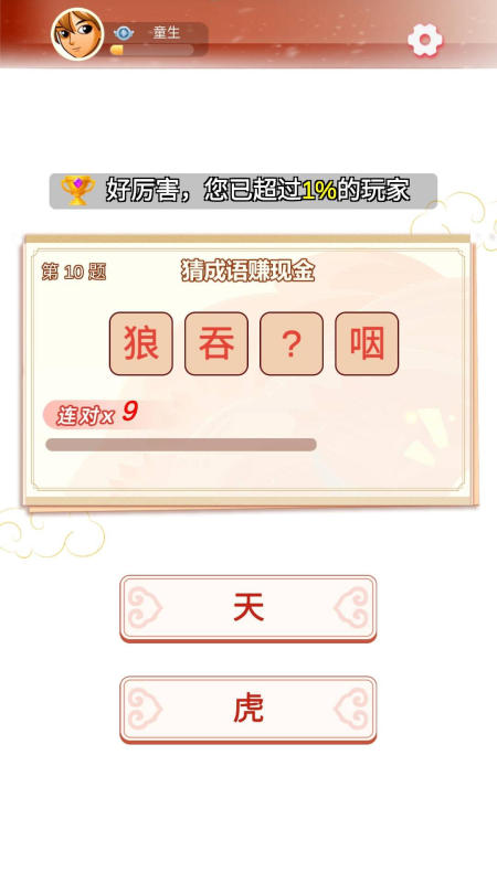 進(jìn)入游戲,你將進(jìn)行成語(yǔ)闖關(guān),還能讓你理解詞語(yǔ),知曉成語(yǔ)的出處,關(guān)卡等級(jí)越高,成語(yǔ)就越晦澀難懂。并且游戲采用成語(yǔ)與闖關(guān)的方式結(jié)合,可以大幅度降低學(xué)習(xí)的枯燥感,讓玩家更能主動(dòng)的探索成語(yǔ)知識(shí)。最重要的是每關(guān)游戲的結(jié)束,官方都能基于你正向的反饋,給不少需要激勵(lì)的玩家們?cè)龃罅诵判呐c成就感。