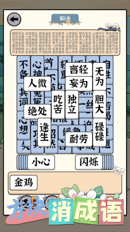 這是一款玩家需要通過(guò)在里面選擇正確的詞語(yǔ)方塊在休閑娛樂(lè)中完成思維訓(xùn)練。解題過(guò)程既能提升詞匯辨析的敏銳度,又能強(qiáng)化邏輯推理能力,讓益智與樂(lè)趣完美融合。它輕松的玩法設(shè)計(jì)正是幫助玩家舒緩壓力的理想選擇。讓我們沉浸在這片寧?kù)o的游戲天地中,享受這段屬于自己的愜意時(shí)光。簡(jiǎn)潔的游戲畫(huà)面,也是讓玩家投身于游戲內(nèi)在的體現(xiàn)。
