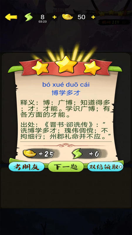 這是一款寓教于樂(lè)的適合不同年齡段玩家學(xué)習(xí)的成語(yǔ)游戲,游戲玩法簡(jiǎn)單,只需要通過(guò)文字填空的方式來(lái)進(jìn)行闖關(guān),而且每個(gè)成語(yǔ)背后都有典故與寓言故事的加持,讓玩家不只是玩一個(gè)成語(yǔ),更多是了解成語(yǔ)背后的本身。讓玩家有效的鍛煉思維的敏捷與準(zhǔn)確性。并且知識(shí)深度廣,讓玩家可以了解到成語(yǔ)背后的文化背景。