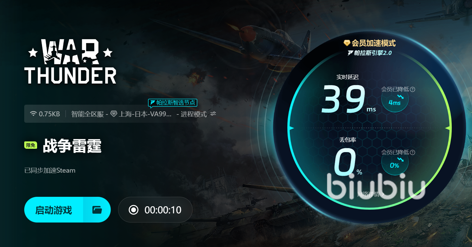 如果在激烈的空戰(zhàn)或地面戰(zhàn)斗中,出現(xiàn)突然的掉幀或卡頓,不僅會影響操作手感,還可能導(dǎo)致關(guān)鍵時刻的判斷失誤,錯失戰(zhàn)機甚至被擊落,實在是太可惜了。而biubiu加速器正好可以解決這類問題。它通過智能加速技術(shù)優(yōu)化網(wǎng)絡(luò)連接,降低延遲與丟包,讓你的游戲過程保持穩(wěn)定流暢。即使在高負載場景下,也能有效保障數(shù)據(jù)傳輸順暢,避免因網(wǎng)絡(luò)問題而拖累戰(zhàn)局,讓每一次戰(zhàn)斗都盡在掌控。