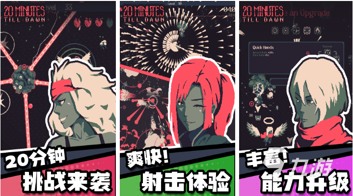 黎明前20分鐘是款將肉鴿、射擊等元素進行融合的獨特游戲,使用各種類型的技能擊殺克蘇魯魔物的玩法非常刺激,流暢爽快的操作+割草式的戰(zhàn)斗風(fēng)格吸引了不少玩家,20分鐘的游戲時長充滿了不確定性,提升等級即可解鎖各種各樣的戰(zhàn)斗技能,暗黑風(fēng)格的畫面表現(xiàn)與滿屏彈幕的特效形成了視覺反差。