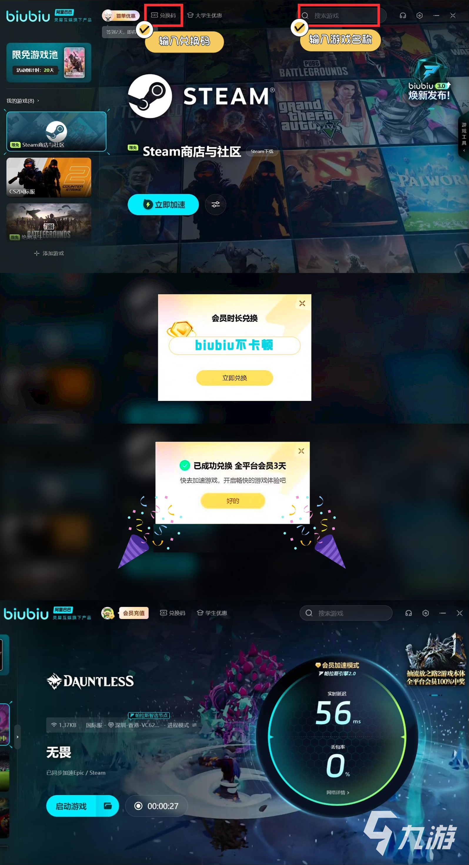 如果你正好需要一個加速軟件,那么不妨試試biubiu這個應(yīng)用,現(xiàn)在注冊成為新用戶,能直接得到3小時的試玩時間,要是再輸入上圖所示的兌換碼【biubiu不卡頓】,還能再領(lǐng)三天的會員,這個福利適用于所有人。