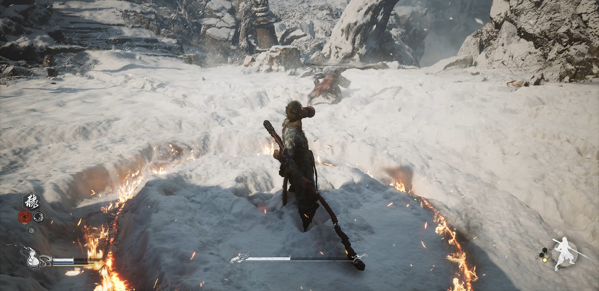 在游戲的界面上可以看到角色目前的狀態(tài),在狀態(tài)欄上包括了角色的血條和藍(lán)條和黃條,黃條也就是角色的精力條,法術(shù)會(huì)消耗藍(lán)條,奔跑、跳躍、棍花都在消耗精力條,一旦精力耗盡的話那么玩家只能在原地行走了,無法進(jìn)行棍棒來施展輸出。