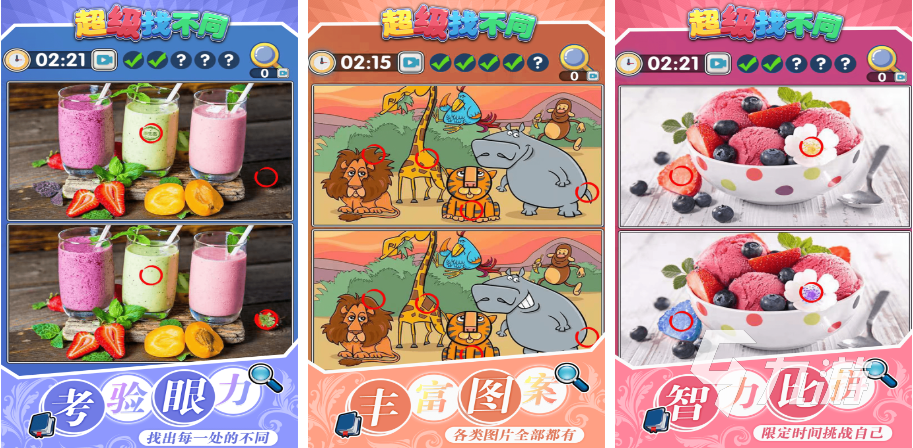 在超級找不同當(dāng)中的玩家將會體驗到一場愉快的找不同游戲體驗,玩家在游戲的同時要注意時間的流逝,找到上下兩張圖片的區(qū)別,并且把他們勾畫出來,這個過程對于玩家的視力和觀察能力有著一定的要求。