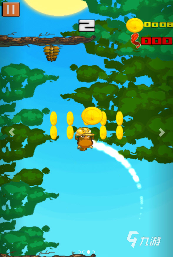 《旋轉(zhuǎn)老鷹》這是一只笨拙拙只會旋轉(zhuǎn)飛行的老鷹,尤其把一個枝繁葉茂的大樹作為了背景,玩家要操縱著老鷹旋轉(zhuǎn)式的向上升空,在途中還需要吃到金幣以及鳥蛋,為老鷹補充體力,這部作品的難點玩家要同時兼具著旋轉(zhuǎn)操控的特性,以及障礙物和收集要素的位置,倘若在上升中頂?shù)綐涓?,你會被樹上的小松鼠嘲諷哦。