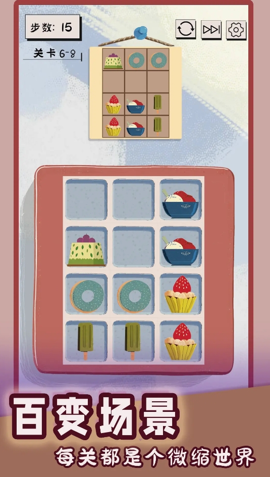 此作會(huì)在關(guān)卡中給出一幅參考圖,并讓各位按參考圖中的物品擺放方式對(duì)謎題進(jìn)行調(diào)整,只要在步數(shù)用完之前將謎題里的物品擺放成參考中的樣子,就能達(dá)成通關(guān)的條件。它的解謎方式有些類(lèi)似于拼圖,各位可朝不同的方向去劃動(dòng)屏幕,以此來(lái)讓物品們改變擺放的位置。并且它的難度會(huì)逐步增加,剛開(kāi)始只是九宮格形式的解謎,后面會(huì)變成4*4的大格,亦或是大小不等的格子,挑戰(zhàn)樂(lè)趣很是不錯(cuò)。