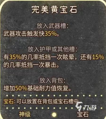 寶石和其他道具相同,都是需要放進(jìn)背包中才會生效,但是有著更嚴(yán)格位置要求,因?yàn)椴煌瑢毷诺讲煌恢茫瑢a(chǎn)生不一樣的效果。游戲中的寶石主要有三類,分別是藍(lán)寶石,紅寶石和黃寶石。寶石也有不同品級,從最初階段,一直到最后的完美,也需要通過升級的方式逐漸得到。升級前后在效果方面也會有所區(qū)別,接下來小編將介紹完美品質(zhì)寶石可以給大家?guī)砟男┰鲆嫘Ч?/p>
