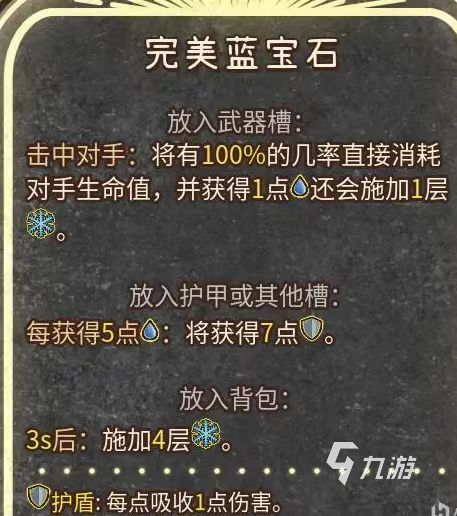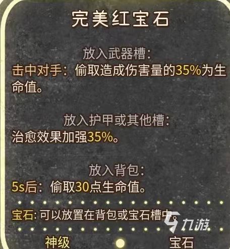 完美藍(lán)寶石放入武器槽中,這樣武器在擊中對手后就會直接消耗對手生命值,并且為對方施加冰冷效果。如果放進(jìn)護(hù)甲槽或者是其他槽,則是變成了額外獲得護(hù)盾,用于吸收傷害。放入背包則是在三秒后直接施加4層冰冷效果。完美紅寶石放入武器槽后生效,在擊中對手時(shí)按照傷害量35%計(jì)算吸取血量,恢復(fù)到自己身上,當(dāng)放入護(hù)甲或者是其他槽后,提升35%治愈效果,放入背包5秒鐘之后偷取30點(diǎn)生命值。這里所說的治愈效果指的就是在接受治療時(shí)所產(chǎn)生的恢復(fù)能力,也相當(dāng)于提高了自身的續(xù)航。具體選擇直接偷取還是放進(jìn)武器中吸血,就要根據(jù)大家的實(shí)際情況來定了。