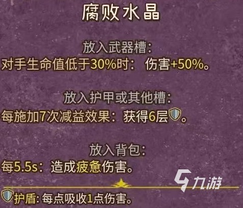 完美黃寶石插入武器槽后提高武器攻擊觸發(fā)幾率,當(dāng)放入護(hù)甲后,有幾率抵擋對方施加過來的一次眩暈,還有幾率抵擋暴擊傷害,放入背包的是增加基礎(chǔ)耐力值恢復(fù)。耐力是很多武器使用的基礎(chǔ),所以耐力在對戰(zhàn)過程中也是很有用的屬性。除了這三類寶石之外,還有另外一個(gè)腐敗水晶,也屬于這一類型。當(dāng)對方生命值低于30%時(shí)增加傷害,放入護(hù)甲槽后,每施加七次減益效果,自身就能獲得6層護(hù)盾,放入背包對敵人造成疲憊傷害。
