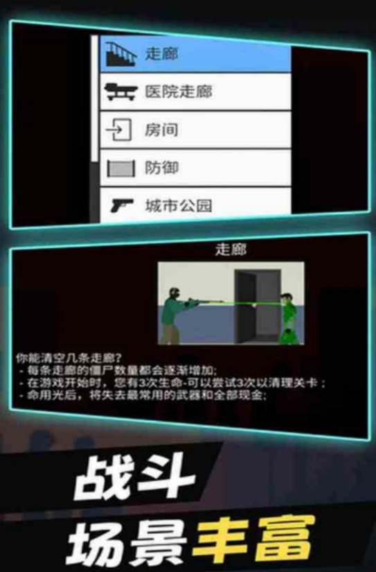 橫版的風格進行展現(xiàn),占據了手機的整個屏幕也帶來了特別方便的操作手法,可通過左右手共同配合的方式完成打僵尸,在面對僵尸洶涌來襲的過程中,必須要利用自身的實力奮力抵抗。游戲整體采用虛擬引擎的方式,帶來了極好的操作體系,而且還呈現(xiàn)出了多個不同的場景,比如有醫(yī)院的走廊以及各種神秘的房間等。