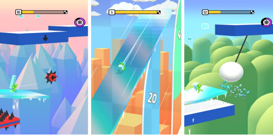 在開局之后就會(huì)看到以冰塊作為主要的角色,呈現(xiàn)出四四方方的正方形形狀,而玩家要通過點(diǎn)擊屏幕的方式操控其中的方塊,完成相應(yīng)的跑酷任務(wù),在這條賽道當(dāng)中可能會(huì)呈現(xiàn)出大量的謎題或者很多的障礙物,需要利用跳躍等多種方式,直接跨越障礙物順利到達(dá)終點(diǎn)。雖然整體的玩法特別簡(jiǎn)單,但是畫面上來看動(dòng)感十足。