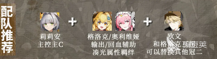 而在配隊(duì)的推薦上面,莉莉安還可以作為陣容當(dāng)中的主要控制以及主要核心輸出角色使用,那么第二個(gè)位置上,大家放格洛克或者是奧利維亞都是可以的,這里格洛克的話是可以幫助莉莉安來(lái)補(bǔ)足一些輸出的,然后如果放奧利維亞的話,為隊(duì)伍帶來(lái)的則是治療以及輔助類型的效果,這兩個(gè)角色目前都是可以跟莉莉安放在一起湊光屬性的羈絆加成的,所以如果有需求的話,大家根據(jù)目前隊(duì)伍上場(chǎng)的情況來(lái)進(jìn)行判定,如果上場(chǎng)的對(duì)手是輸出比較強(qiáng)大的角色,那就上格洛克來(lái)保證我方的輸出數(shù)據(jù)能夠足夠應(yīng)對(duì)對(duì)方,如果對(duì)方的異常攻擊比較強(qiáng)大的話,大家就可以讓奧利維亞放在這里,來(lái)保證隊(duì)伍有足夠的生存能力。